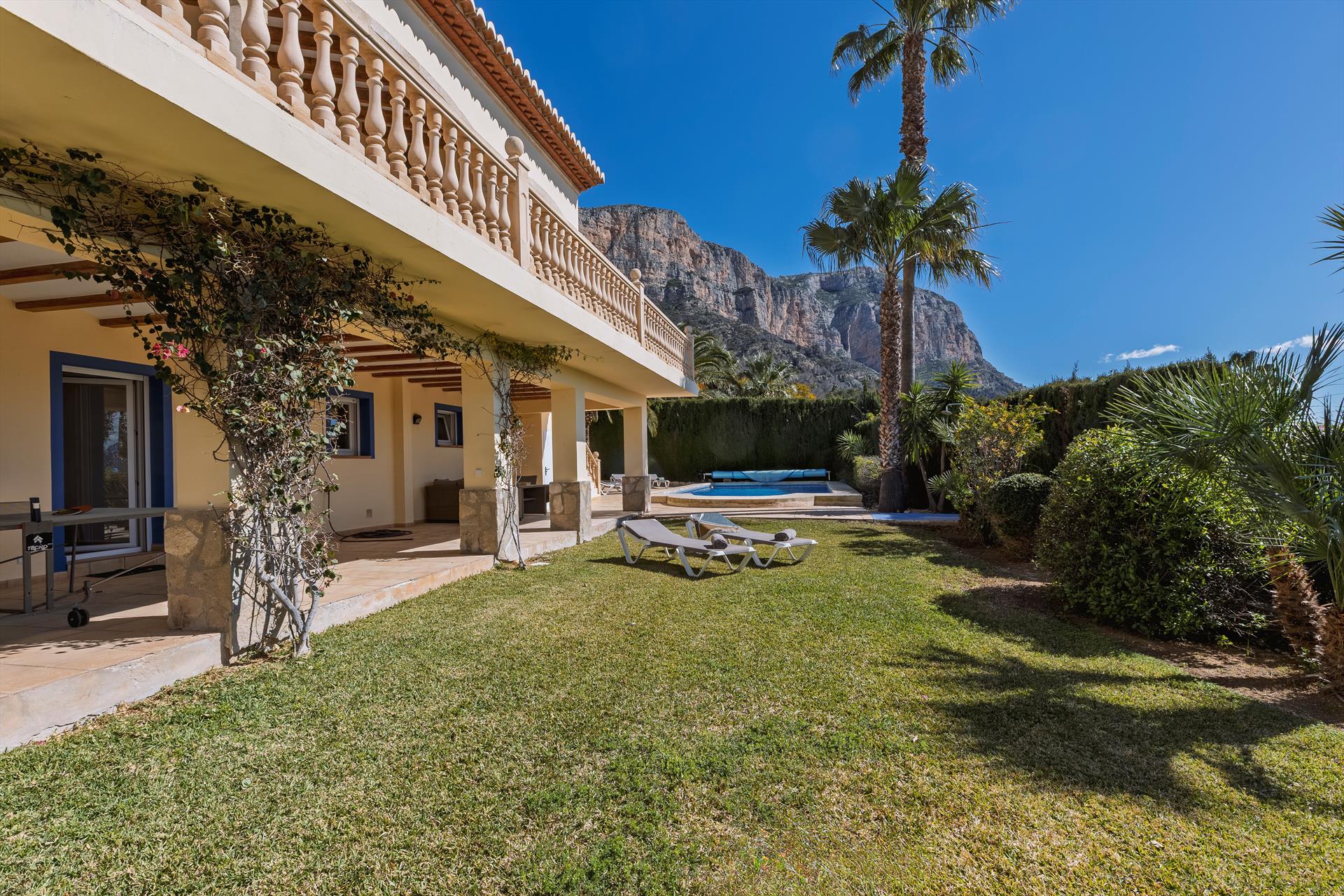 Magnifique et confortable maison de vacances avec piscine chauffée à Javea, Costa Blanca, Espagne, pour 8 personnes. La maison est située dans un quartier résidentiel.